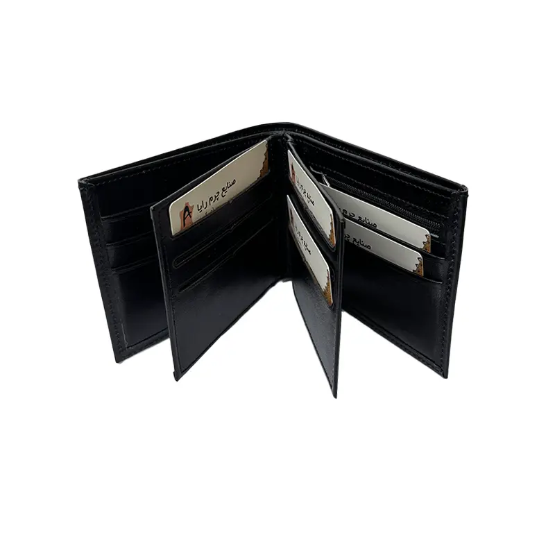 کیف پول چرم رایا طرح آریا به شکلی طراحی شده که بدون حجیم شدن، فضای کافی برای کارتها و اسکناسها فراهم کند.